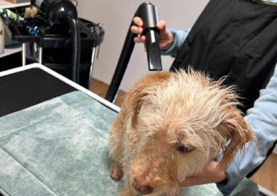 Nach dem Baden wird das Fell Ihres Hundes fachgerecht und stressarm geföhnt. Das professionelle Föhnen im Hundesalon verhindert Verfilzungen, sorgt für Volumen im Fell und bereitet es optimal auf weitere Pflegebehandlungen vor.